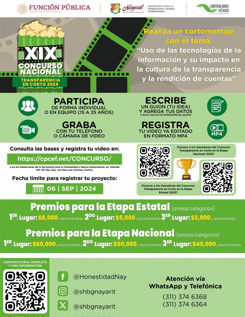 La Secretaría para la Honestidad y Buena Gobernanza de Nayarit invita a los jóvenes entre 15 y 25 años a participar en el Concurso Estatal y Nacional de Transparencia en Corto 2024. Este concurso busca fomentar la participación activa de la juventud en la cultura de la legalidad y rendición de cuentas a través de la creación de cortometrajes sobre transparencia.